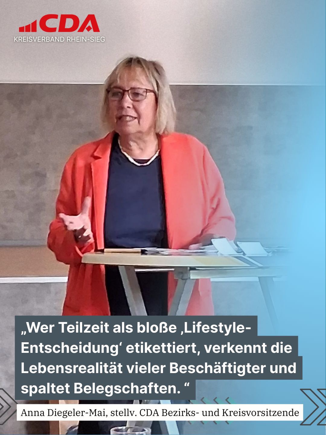 „Der Antrag arbeitet mit pauschalen Unterstellungen und trifft am Ende die Falschen: Beschäftigte in belastenden Lebenslagen, Familien, Pflegende und Menschen in gesundheitlich oder psychisch fordernden Berufen“, erklärt [Name], stellvertretender Kreisvorsitzender der CDA Rhein-Sieg. „Wer Teilzeit pauschal als ‚Lifestyle-Entscheidung‘ abqualifiziert, verkennt die Lebensrealität vieler Arbeitnehmerinnen und Arbeitnehmer und riskiert eine Spaltung der Belegschaften.“