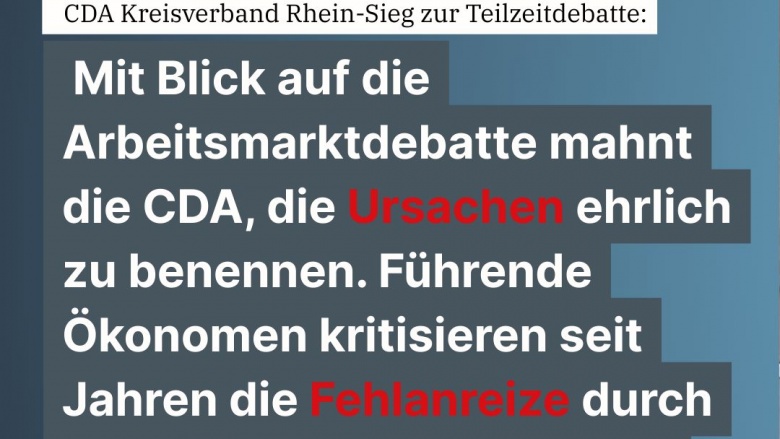 Die Christlich-Demokratische Arbeitnehmerschaft (CDA) im Rhein-Sieg-Kreis kritisiert den Antrag der Mittelstands- und Wirtschaftsunion (MIT) zum bevorstehenden CDU-Bundesparteitag, mit dem das gesetzlich verankerte Recht auf Teilzeit erheblich eingeschränkt werden soll.